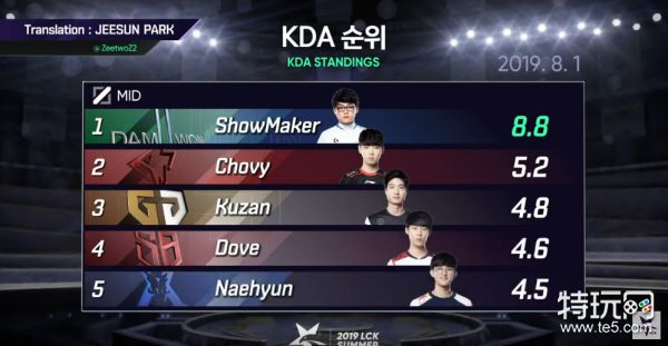 ShowMaker以8.8的KDA遥遥领先,随后分别是Chovy、Kuzan、Dove和Naehyun