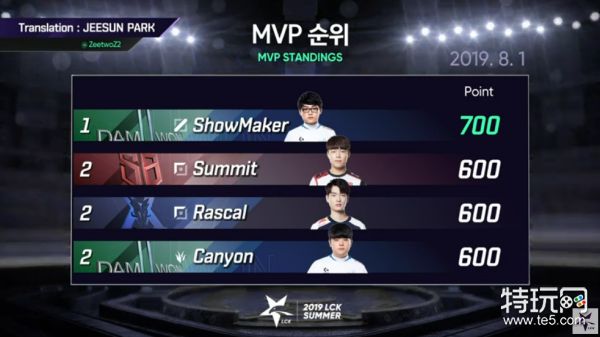 MVP榜,ShowMaker以700分占据榜首,随后Summit、Rascal、Canyon都以600分紧随其后。