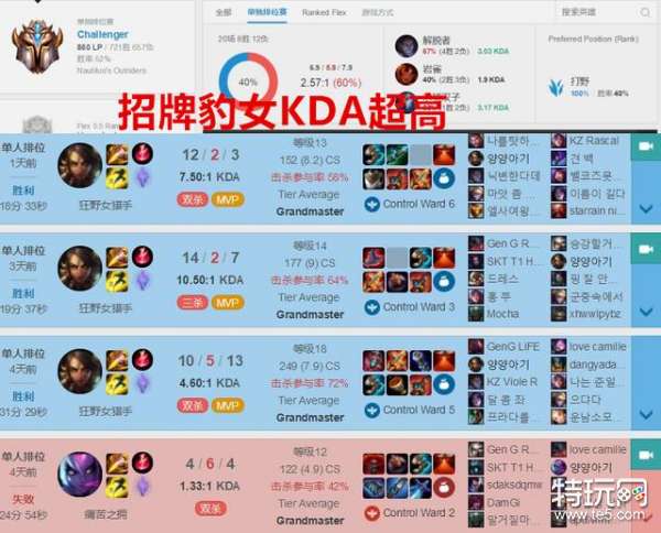 在查询乐言的战绩之后发现只要他拿到豹女基本上都赢了,而且很干净利落,其次即使是输的局乐言的豹女也基本上能够拿到不错的KDA,根据队友的数据来看,基本上都是队友大劣势,而这位17岁小将也是数次冲击到韩服前五,实力可见非同一般。