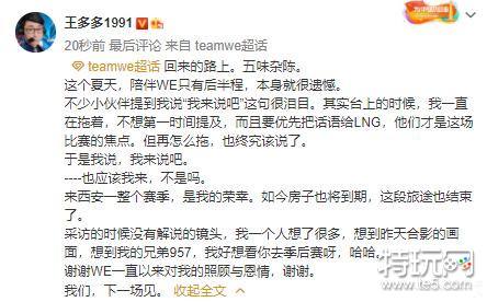 在WE确定无缘季后赛后,王多多发了一段感慨的话,里面称想到了他的好兄弟957,好想看他去季后赛,并谢谢WE一直以来对他的照顾,下一场见。
