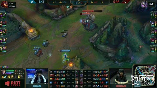 在第三局比赛中,他们表现得相当好。SKT并没有对他们的下路施加压力,而是围绕上路为Khan防守。这些小冲突并没有对SKT有利,反而更糟糕的是,尽管Teddy拿到优势,Clid也并没有将双人路换到中间,来确保他们的安全,或者试图用中路兵线牵制对方。因此当GRF拿到优先权的时候,Khan崩了,这很容易让人想起他在LZ的那些日子。
