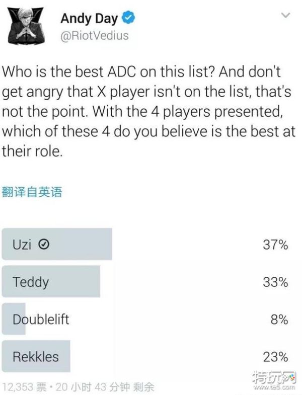 9月21日晚上,Riot的官方解说Vedius在推特上也发起了一项投票:下列名单中谁是目前最强的adc?如果你想看到的人不在里面也不要生气啦,这不是重点,就在这四个里面挑吧,谁是你觉得目前的世界第一ad?