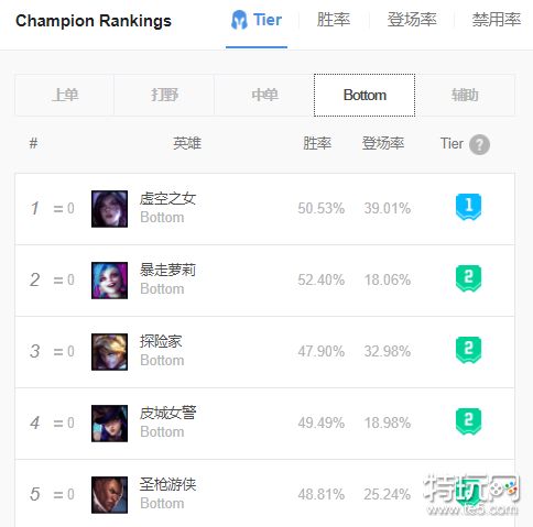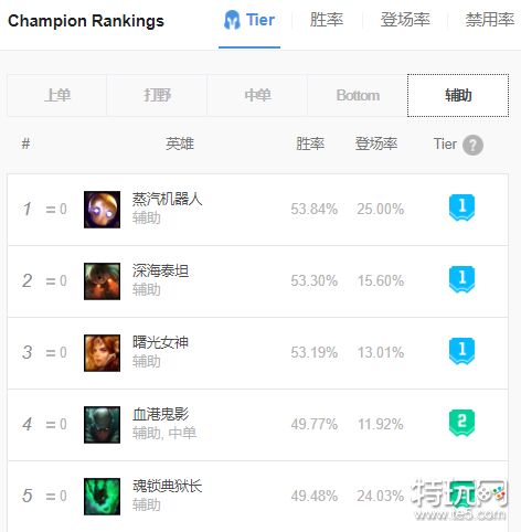 辅助位置,机器人在加强后表现亮眼,在高出场率的情况下,拥有53.84%的高胜率,或许我们会在世界赛上看到机器人的登场。除此以外,T1辅助还有泰坦、日女,胜率都在50%以上。