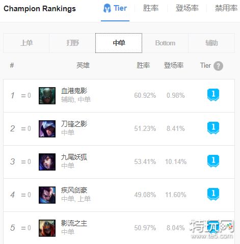 T1级别强势中单英雄除了有常见的男刀、狐狸、亚索、劫以外,还有一个新面孔——派克。原本遭到削弱的派克几乎只能在辅助位置生存,然而在新版本里,虽然登场率不高,但胜率高达60.92%的他,稳坐T1中单位置。