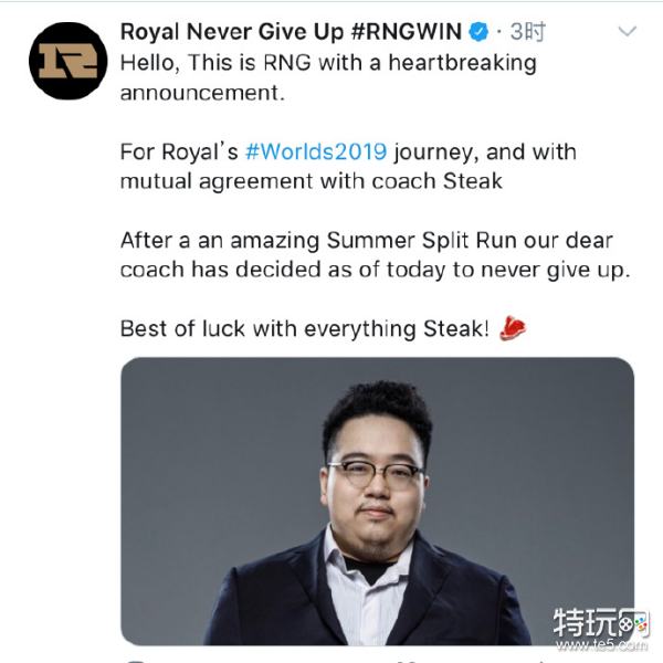 RNG官推骚操作:关于牛排 有个心碎的消息宣布