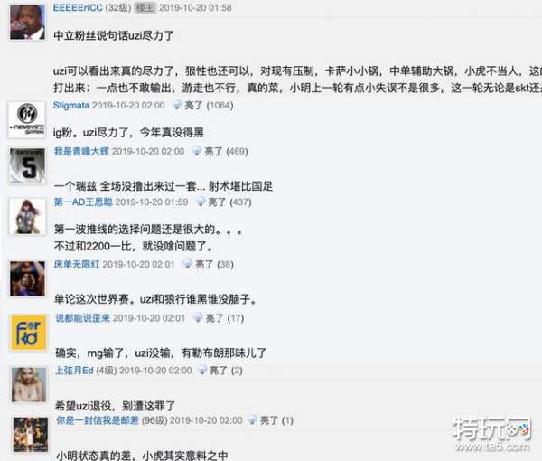 对于楼主的观点网友们也是议论纷纷,有网友表示“ig粉,觉得uzi尽力了,今年真没得黑,一个瑞兹,全场没撸出来过一套... 射术堪比国足,单论这次世界赛,uzi和狼行谁黑谁没脑子!”