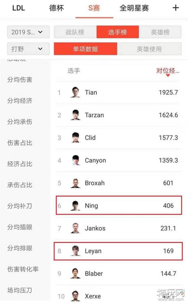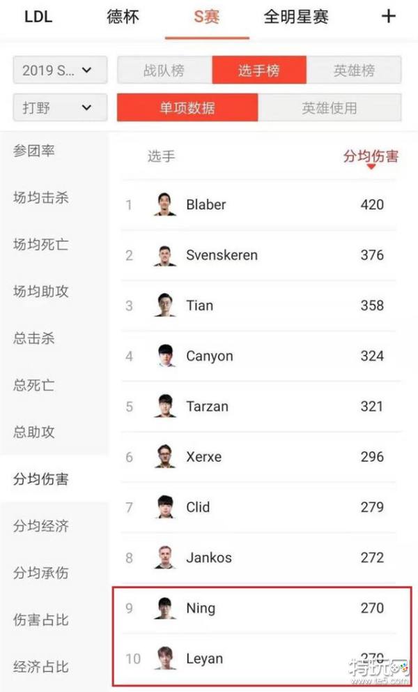 分均伤害这边其实对于打野选手来说,没有太大的参考意义,不过小组赛中表现出色的打野比如tian、Tarzan和canyon的分均伤害都很高,ning和乐言两人的分均伤害也完全一样,数据270,排在十八位打野的中游位置。