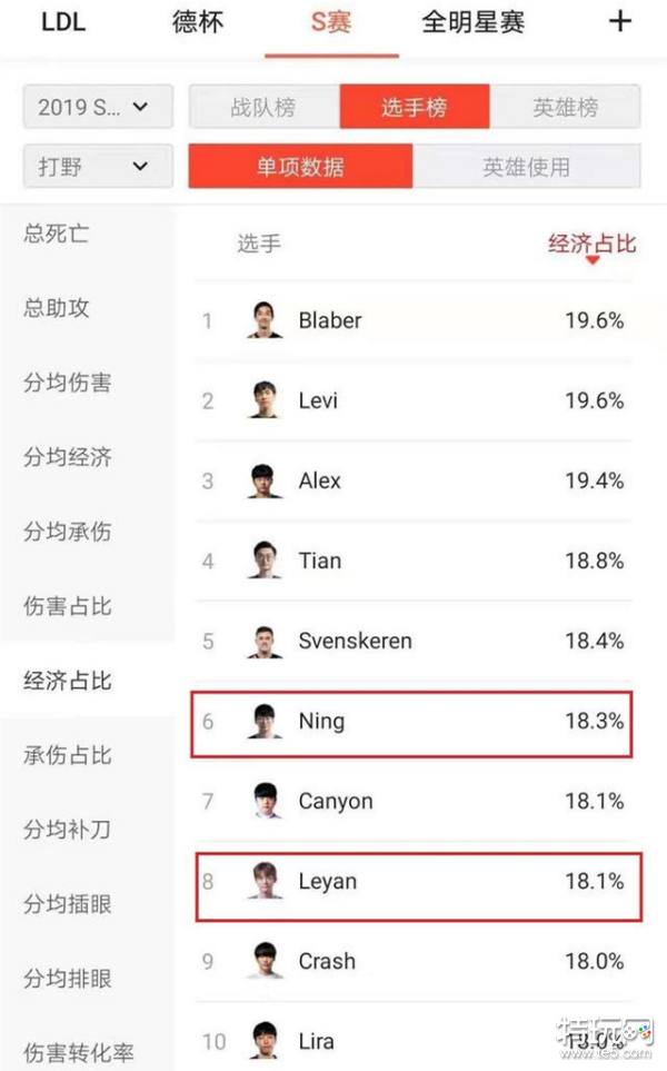 经济占比按理说也没必要讨论的,但是因为LPL夏季赛的时候,Ning被喷的最惨的一段时间,他就是经济占比太高,高的离谱。但是经过几个月的替补之后,大家都看得到ning的打法的改变,不再那么独了,S赛经济占比这边ning排在第六,乐言排在第八,数据差距不大。