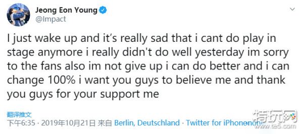 今日,TL战队上单选手Impact推特发表了自己对于本次世界赛的感言以及对粉丝的致歉。