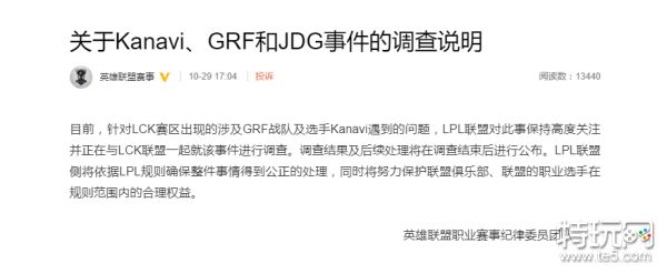 “目前,针对LCK赛区出现的涉及GRF战队及选手Kanavi遇到的问题,LPL联盟对此事保持高度关注并正在与LCK联盟一起就该事件进行调查。调查结果及后续处理将在调查结束后进行公布。