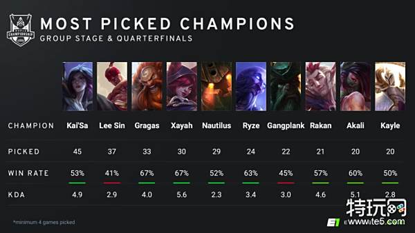 目前S9世界赛共进行了66场比赛,卡莎出场45次成为了最受欢迎的英雄。其次是盲僧、酒桶、霞、泰坦、瑞兹、船长、洛、阿卡丽和天使。