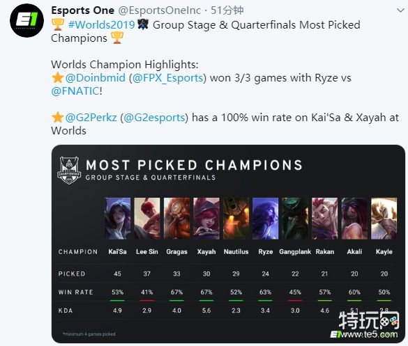 不知不觉中,2019全球总决赛的赛程已进行大半。EsportsOne官推发布了小组赛和四分之一决赛期间被选择最多的十位英雄,统计了它们各自的胜率以及KDA数据。
