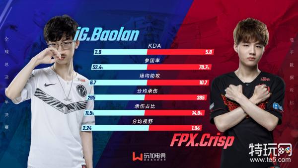最后是辅助选手的数据对比,Crisp更胜一筹,他在KDA、参团率、场均助攻、分均承伤方面都有着明显优势,但Baolan的视野做的更好。