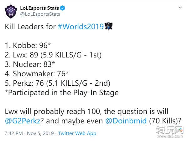 LWX很有机会打到100杀,问题是Perkz甚至Doinb(70杀)可以达到吗?