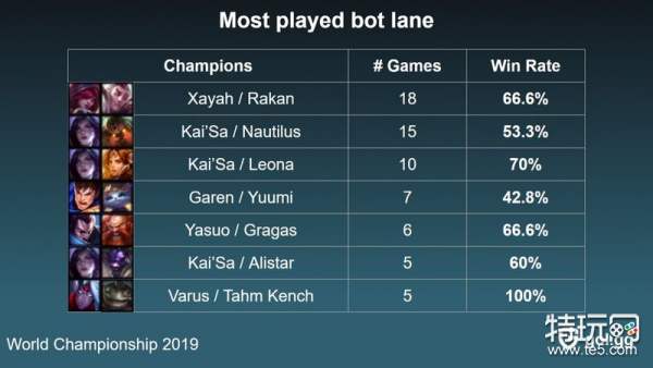 国外数据大师今日更新了本次世界赛,使用最多的下路组合。