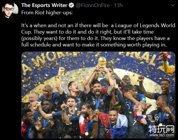 近日,ESPN记者Fionn曾爆料拳头已经讨论了一种以国家为单位的世界杯类型的杯赛的可能性,随后该消息引发大家热烈讨论。今天,他又在推特上发布了拳头游戏高层对“英雄联盟世界杯”的回复: