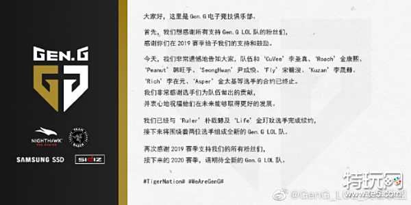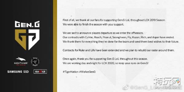 首先,我们想感谢所有支持Gen.G LOL队的粉丝们,感谢你们在2019赛季给予我们的支持和鼓励。