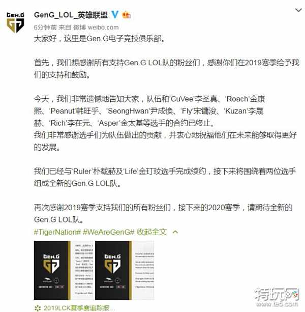 再次感谢2019赛季支持我们的所有粉丝们,接下来的2020赛季,请期待全新的Gen.G LOL队。