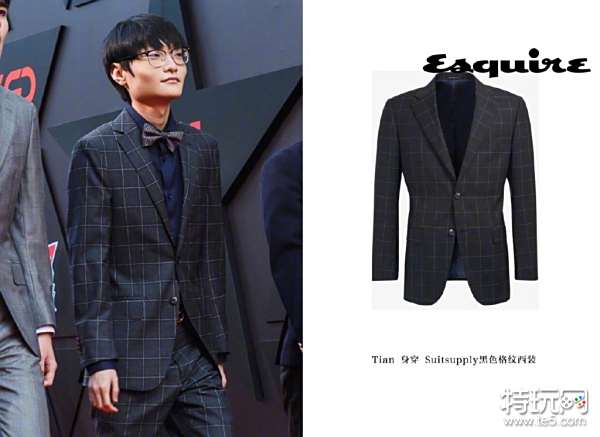 Tian选择了更具现代感的Suitsupply格纹西装,搭配以藏青色内搭衬衫,金属感条纹领结则与菲拉格慕的金色Gancini扣饰一同作为点缀,与其他人相比,他的造型显然更年轻化,这也与他全队最小的年龄恰好相符。