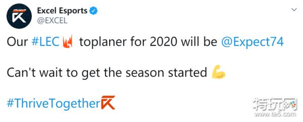 Excel官推发布消息:我们2020年的上单依然是Expect选手,等不及要开始新赛季啦