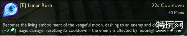 黛安娜变成复仇之月的活体化身,突进到一名敌人身边造成40(+0)的魔法伤害,如果敌人受到月光效果的影响,技能的冷却时间将重置。