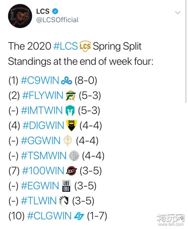 就在刚刚C9和EG的比赛结束后,LCS完成了他们第四周的全部赛事,LCS官推了前四周战队的排名情况: