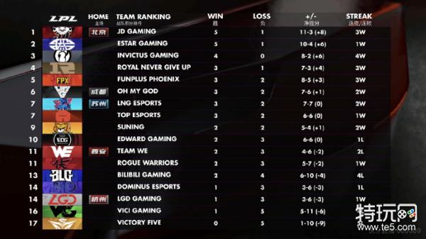 3月18日的比赛结束了,来看一下今天过后的LPL各战队排名情况