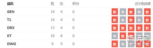 T1常规赛收获14-4(小分16)的战绩,若DRX今日2:0击败APK,T1的排名将来到第三。