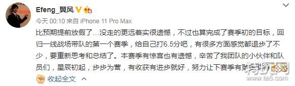 eStar在季后赛第一轮中不敌WE结束春季赛的旅程,赛后eStar经理更新微博:
