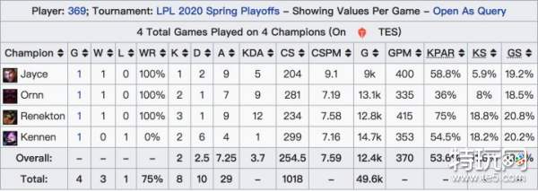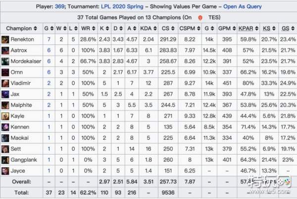 你可能会觉得我在贬低369,但是数据能够体现出实力。369常规赛使用最多的4个英雄,奥恩(6场50%胜率),铁男(6场66.7%胜率),剑魔(6场100%胜率),鳄鱼(7场28.6%胜率)。这里面进攻性最强,最有当大C战术核心的鳄鱼是使用最多,胜率最低的。在TES的部分中我有提到过369的输出占比,22.6%。与之对比的是Theshy的28.6%。你可以说是队伍在战术上的选择导致369更偏团队输出不高,但是既然IG能选择Theshy当输出担当,为什么TES不选择369当这个C位呢?