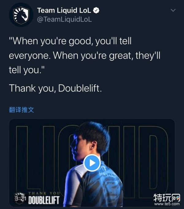 在TSM官宣了Doublelift重新连接之后,TL也更新了推特感谢大师兄多年来的付出: