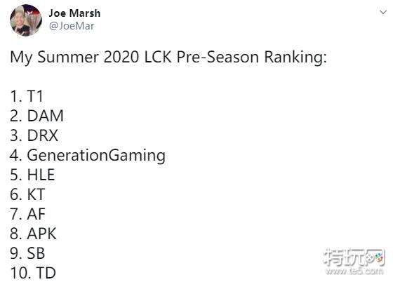 今天,T1老板Joe Marsh更新推特,为2020LCK夏季赛的战队进行了排名