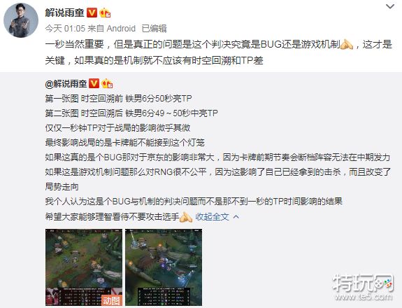第一张图 时空回溯前 铁男6分50秒亮TP 第二张图 时空回溯后 铁男6分49~50秒中亮TP仅仅一秒钟TP对于战局的影响微乎其微最终影响战局的是卡牌能不能接到这个灯笼如果这真的是个BUG那对于京东的影响非常大,因为卡牌前期节奏会断档阵容无法在中期发力如果这是游戏机制问题那么对RNG很不公平,因为这影响了自己已经拿到的击杀,而且改变了局势走向我个人认为这是个BUG与机制的判决问题而不是那不到一秒的TP时间影响的结果希望大家能够理智看待不要攻击选手