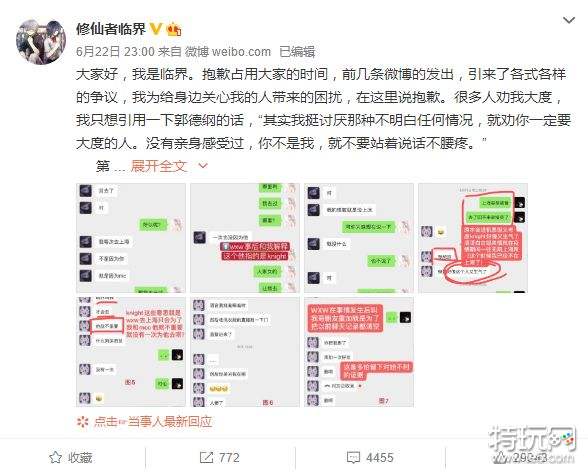 昨晚23点,临界微博发出小作文,继续控诉Knight,文章条理清晰,大概就是完整的把昨天他的言论重复了一遍同时附上几张“实锤”截图。