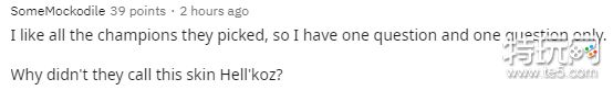 我很喜欢这三个英雄,但我有一个问题。为什么他们不给大眼的皮肤起个Hell'koz的名字?(Hell和Infernal在西方文化中都有炼狱、炼狱的涵义)