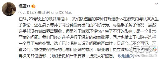在6月23号晚上的峡谷排位中,我们队伍里的替补打野选手vv在游戏内与队友发生了争论,还在泉水等待了两分钟没有出门的不好行为。与选手了解了情况,虽然选手并没有做出辱骂现象,但是对于游戏环境也产生了不好的影响,是一个非常严重的问题。我们已经对选手进行了深刻的教育批评,同时也做出了扣除vv选手一个月工资的处罚。选手已经深刻认识到问题的严重性,保证今后不会再犯。不管如何,排位要保持好的心态和正确的态度,职业选手更应该规范自己的言行,再次向各位道歉,我们会更加严格要求,接受大家监督。