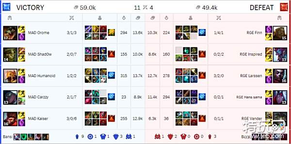 BP阶段,MAD选到了翠神沙皇鳄鱼的上中野搭配赛娜猴子,RGE则选到了维鲁斯塔姆,上路则是俄洛伊。