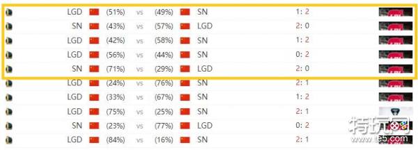 比较有趣的是,目前两队总共交手十次,在2018年12月Suning Gaming正式改名为Suning之前,LGD对阵SNG的战绩为4胜3负,但在SN改名之后,LGD面对SN的三场比赛均以战败告终。
