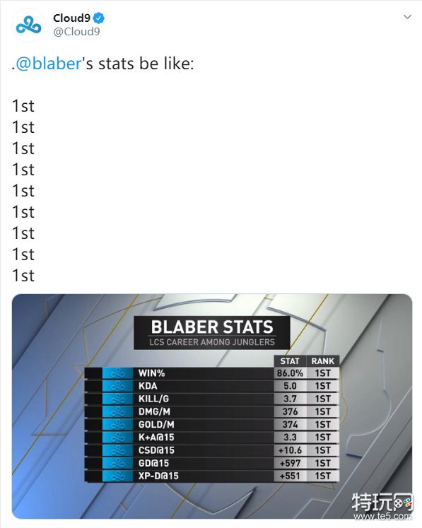 导读:C9官方发布打野Blaber数据 所有数据均为第一名