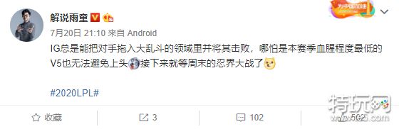 解说雨童:IG总是能把对手拖入大乱斗的领域里并将其击败,哪怕是本赛季血腥程度最低的V5也无法避免上头,接下来就等周末的忍界大战