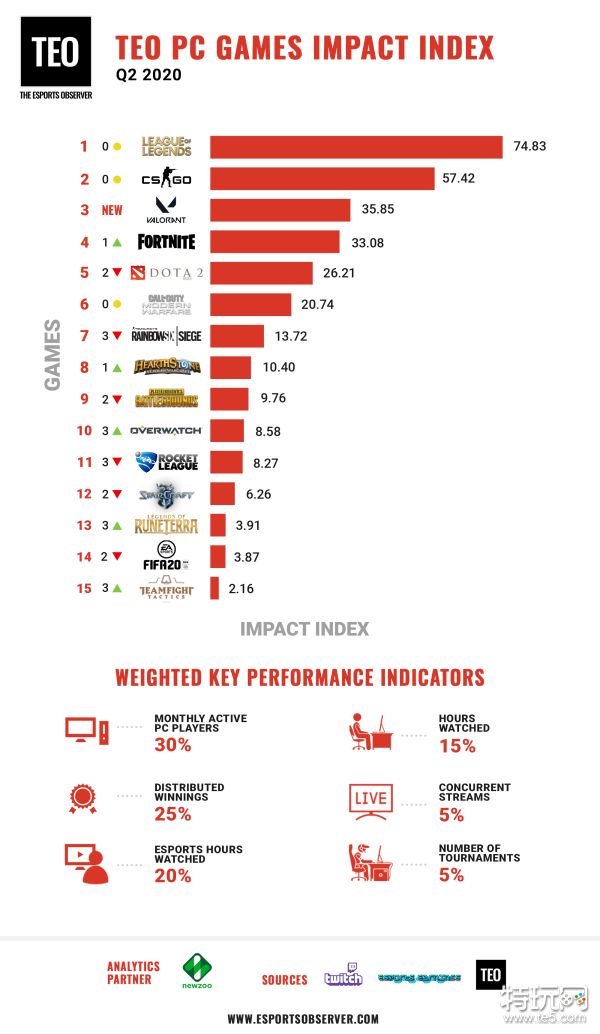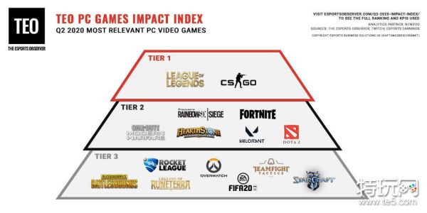 该榜单通过综合游戏月活跃玩家数量、赛事奖金、电竞赛事观看人数、游戏观看时长、同步直播数量和比赛数量等数据分析得出一款游戏在一个季度中的影响力指数。作为影响力最大的与电竞相关的PC游戏,《英雄联盟》与《CSGO》并列第二季度的T1梯队。
