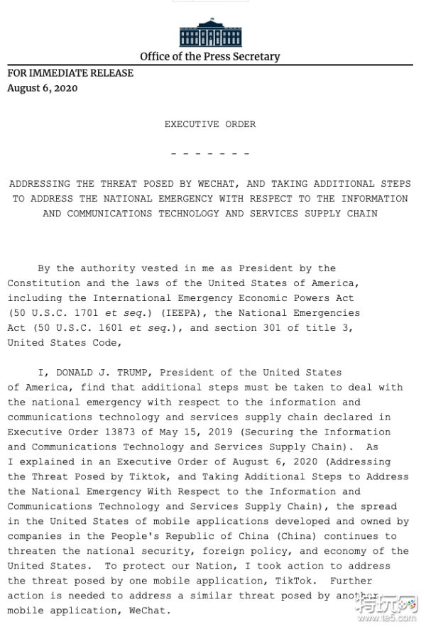 在行政命令中,特朗普表示禁止任何人与腾讯或该实体的任何子公司进行任何与微信有关的交易,或受美国司法管辖的财产有关的任何交易。