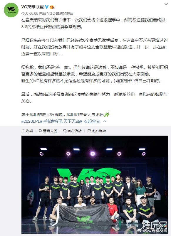 在春天结束时我们曾许诺下一次我们会将命运紧握手中,然而很遗憾我们最终以8-8的成绩止步激烈的夏季常规赛。仔细数来在今年以前我们已经连续6个赛季无缘季后赛,在这当中不乏有更难过的时刻。好在我们没有放弃并有了如今这支全联盟最年轻的队伍,并一步一步在接近着一直以来的目标...很抱歉,我们还是“差一点”。但与其说这是遗憾,不如说是一种希望。希望能再积蓄更多的能量如超新星般爆发,希望能变成更好的我们出现在大家面前。新生的VG还有许多的不足但也还是有许多的可能,我们依旧相信自己并期待。最后,感谢8名选手及赛训组这赛季的拼搏与努力,感谢粉丝们一直以来的鼓励与关心。属于我们的夏天结束啦,我们明年春天再见吧