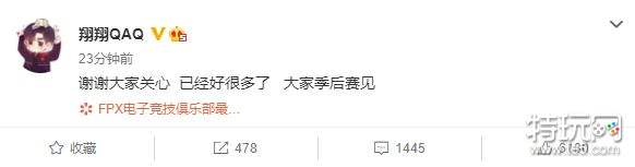 这样的局势对于FPX的季后赛形势非常不乐观,不过就在今天下午,LWX更新微博,表示自己已经好很多了,并告诉大家季后赛见。