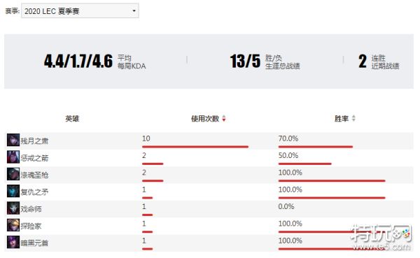 Hans sama在夏季赛中使用7个不同的英雄,其中最高登场率的厄斐琉斯出场10次胜率高达70%