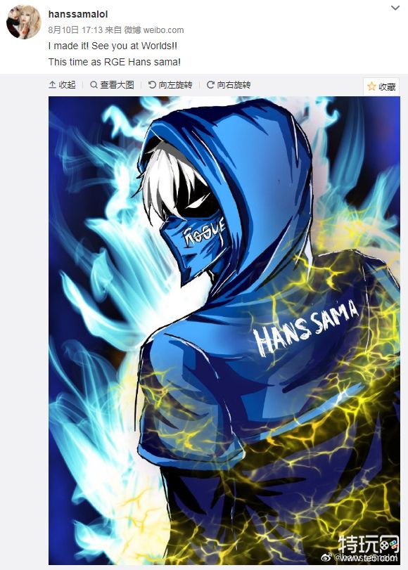 昨日Rogue确定作为S10第一支参赛队伍,同时也是Hans sama自2017年后再次进入世界赛。Hans sama更新微博: