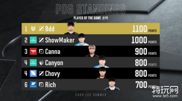 在8月9日的LCK夏季赛常规赛结束后,POG积分榜的榜首仍由Bdd所占据,DWG的中单ShowMaker紧随其后,成为第二个POG积分达到1000点的选手。