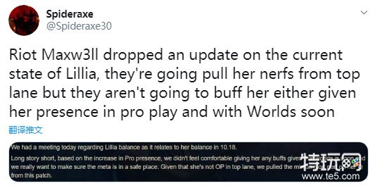 “世界赛快要来了,我很想确保莉莉娅稳定在一个安全的位置。考虑到她在上路不是特别OP,因此我们在这个补丁里只会让Q技能对兵线的伤害削弱。同时为了不出岔子,在削弱后她不会得到任何的补偿。”
