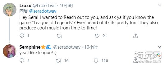 今天Seraphine还回复了网友的提问,表示她非常喜欢英雄联盟