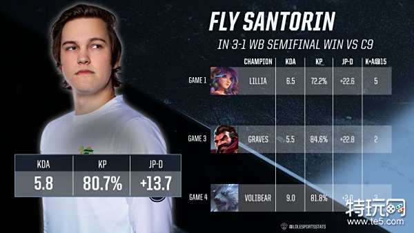 FLY打野选手Santorin表现亮眼,当选了该系列赛的MVP。他在三场比赛中使用了莉莉娅,男枪,狗熊帮助队伍拿下胜利。他在这三场中打野亲近度都高于Blaber,并且保持了很高的击杀参与度和KDA。